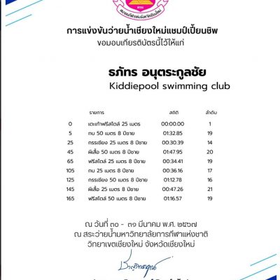 เด็กชายธภัทร อนุตระกูลชัย ป.1/2 รางวัล 2 เหรียญทอง 3 เหรียญเงิน 1 เหรียญทองเเดง ในการแข่งว่ายน้ำ เชียงใหม่แชมป์เปี้ยนชิพ