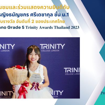 ขอชื่นชมและแสดงความยินดีกับ เด็กหญิงธนัญชกร ศรีเดชากุล นักเรียนชั้นมัธยมศึกษาปีที่ 1 ได้รับรางวัลอันดับที่ 2 ของประเทศไทย (𝟵𝟵/𝟭𝟬𝟬 คะแนน) จากการสอบ Piano Grade 5 ในการแข่งขัน 𝐓𝐫𝐢𝐧𝐢𝐭𝐲 𝐀𝐰𝐚𝐫𝐝𝐬 𝐓𝐡𝐚𝐢𝐥𝐚𝐧𝐝 𝟐𝟎𝟐𝟑 ณ 𝐓𝐫𝐢𝐧𝐢𝐭𝐲 ThailandBangkok Art & Culture Centre (BACC) จัดโดย Trinity College London เมื่อวันที่ 6 เมษายน 2567