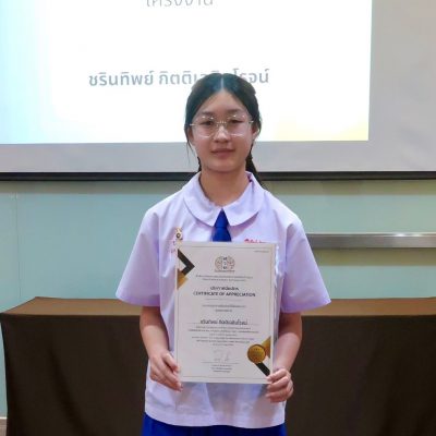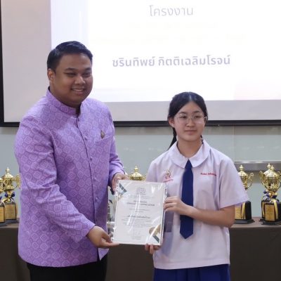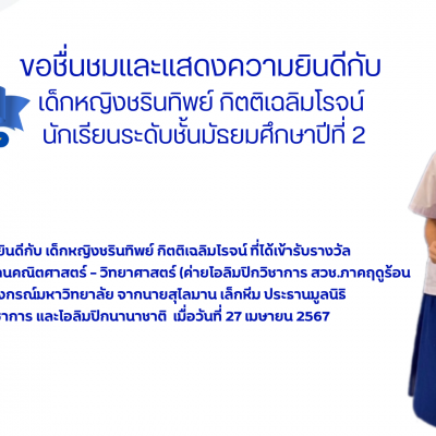 ขอชื่นชมและแสดงความยินดีกับ เด็กหญิงชรินทิพย์ กิตติเฉลิมโรจน์ นักเรียนชั้นมัธยมศึกษาปีที่ 2 ที่ได้รับรางวัล 10 สุดยอด แนวคิดโครงงานคณิตศาสตร์ – วิทยาศาสตร์ (ค่ายโอลิมปิกวิชาการ สวช. ภาคฤดูร้อน ประจำปี 2567) ณ จุฬาลงกรณ์มหาวิทยาลัย จากนายสุไลมาน เล็กหีม ประธานมูลนิธิโครงการสอนวัดทักษะวิชาการและโอลิมปิกนานาชาติ เมื่อ วันที่ 27 เมษายน 2567
