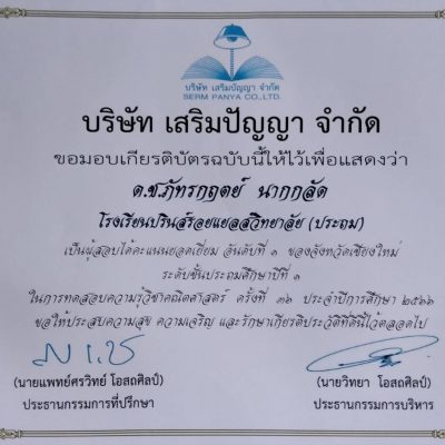 ขอชื่นชมและร่วมแสดงความยินดีกับ เด็กชายภัทรกฤตย์ นากกลัด นักเรียนระดับชั้นประถมศึกษาปีที่ 2/10 ได้รับเกียรติบัตรเป็นผู้สอบได้คะแนนยอดเยี่ยม อันดับ 1 ของจังหวัดเชียงใหม่
