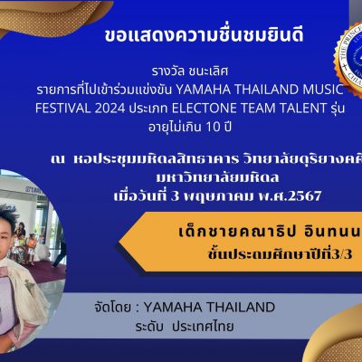 ขอชื่นชมและร่วมแสดงความยินดีกับ เด็กชายคณาธิป อินทนนท์ ชั้นประถมศึกษาปีที่ 3/3 รางวัล ชนะเลิศ รายการที่ไปเข้าร่วมแข่งขัน Yamaha Thailand Music Festival 2024 ประเภท Electone Team Talent รุ่นอายุไม่เกิน 10 ปี ณ หอประชุมมหิดลสิทธาคาร วิทยาลัยดุริยางคศิลป์ มหาวิทยาลัยมหิดล เมื่อวันที่ 3 พฤษภาคม พ.ศ.2567 จัดโดยสถาบันดนตรียามาฮ่า ระดับประเทศ