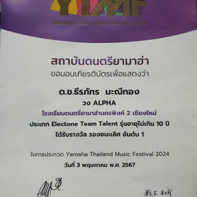 จากการเเข่งขัน Yamaha Thailand Music Festival 2024 รอบชิงชนะเลิศระดับประเทศ ประเภท Electone Team Talent รุ่นอายุไม่เกิน 10 ปี (ระดับประเทศ)