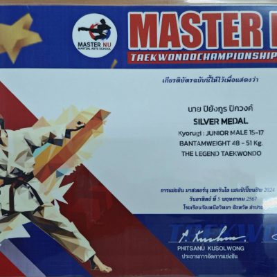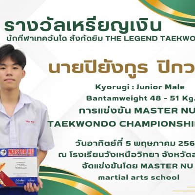 ขอชื่นชมและแสดงความยินดีกับ นายปิยังกูร ปิกวงค์ ม.5/1 สังกัดยิม The Legend Taekwondo ได้รับรางวัล Silver Medal Kyorugi : Junior Male Bantamweight 48 – 51 Kg. จากการแข่งขันMASTER NU TAEKWONDO CHAMPIONSHIP 2024 เมื่อวันอาทิตย์ที่ 5 พฤษภาคม 2567 ณ โรงเรียนวังเหนือวิทยา จังหวัดลำปาง จัดแข่งขันโดย MASTER NU martial arts school (ระดับภาค)