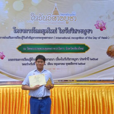 ขอชื่นชมและแสดงความยินดีกับ นายณฐพล ชื่นมนุษย์ ม.5/11 ที่ได้รับรางวัลรองชนะเลิศอันดับ 2 จากการประกวดเรียงความ โครงการโลกยุคใหม่ ในวันวิสาขบูชา มหกรรมด้านพระพุทธศาสนา ประจำปี 2567 โครงการส่งเสริมการเรียนรู้วันสำคัญทางพระพุทธศาสนา (International recognition of the Day of Vesak) วันที่ 20 พฤษภาคม 2567 ณ วัดพระธาตุดอยสุเทพราชวรวิหาร จัดกิจกรรมโดย วัดพระธาตุดอยสุเทพราชวรวิหาร (ระดับจังหวัด)