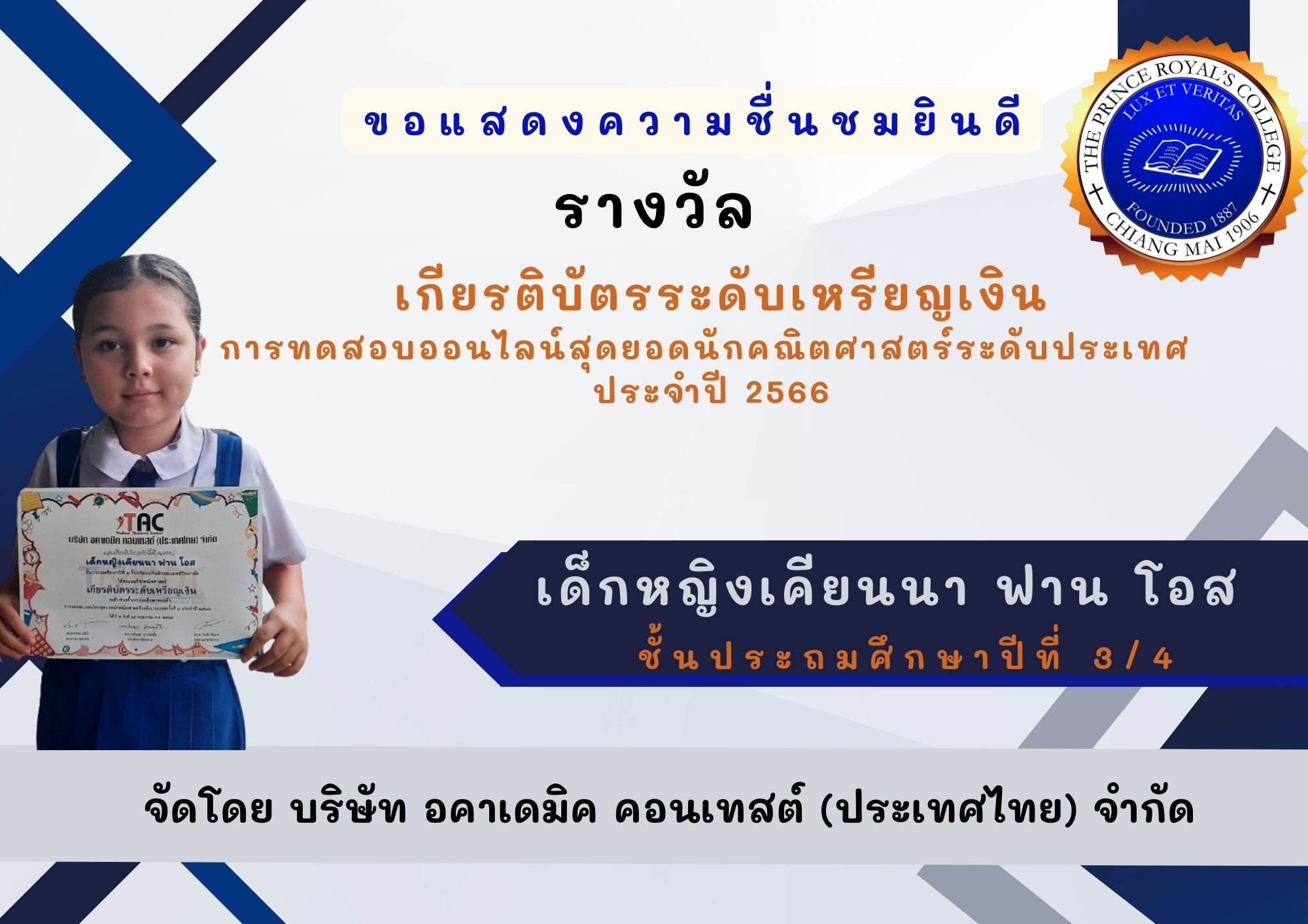 ขอชื่นชมและร่วมแสดงความยินดีกับเด็กหญิงเคียนนา ฟาน โอส ชั้นประถมศึกษาปีที่ 3/4 ที่ได้รับรางวัลเกียรติบัตรระดับเหรียญเงิน คะแนนอันอับที่ 21 ของประเทศ การทดสอบออนไลน์สุดยอดนักคณิตศาสตร์ระดับประเทศ ประจำปี 2566 (Thailand Mathematician Champion Online Test) TMCOT จัดโดย บริษัท อคาเดมิค คอนเทสต์ (ประเทศไทย) จำกัด เมื่อวันที่ 16 มีนาคม 2567