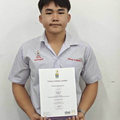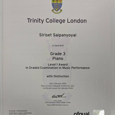 ขอชื่นชมและแสดงความยินดีกับ นายสิริเศรษฐ์ สายปัญโญใหญ่ ม.4/5 ที่ได้รับรางวัล Grade 3 Piano with Distinction (เกียรตินิยมอันดับ 1 ผลคะแนน 90/100) จากการแข่งขัน Classical Piano Trinity Grade 3 ระดับ Foundation Certificate (รูปแบบออนไลน์) วันที่ 26 กุมภาพันธ์ 2567 ณ Digital Online at Little Pianist Studio จัดกิจกรรมโดย Trinity College London (ระดับประเทศ)