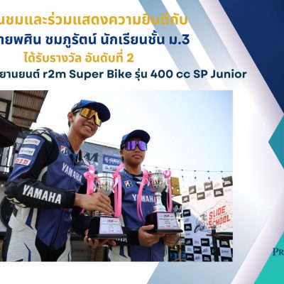 ขอชื่นชมและแสดงความยินดีกับ เด็กชายพศิน ชมภูรัตน์ นักเรียนชั้นมัธยมศึกษาปีที่ 3 ได้รับรางวัลชนะเลิศลำดับที่ 2 การแข่งขันจักรยานยนต์ รายการ r2m Super Bike รุ่น 400 cc SP Junior ในนามทีม Yamaha Thailand Racing Team วันที่ 12 พฤษภาคม 2567