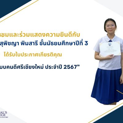 ขอชื่นชมและแสดงความยินดีกับ เด็กหญิงสุพิชญา พิมสารี นักเรียนชั้นมัธยมศึกษาปีที่ 3 ได้รับใบประกาศเกียรติคุณ “ต้นแบบคนดีศรีเชียงใหม่ ประจำปี 2567” วันที่ 2 มีนาคม 2567 ณ มหาวิทยาลัยฟาร์อีสเทอร์น เชียงใหม่