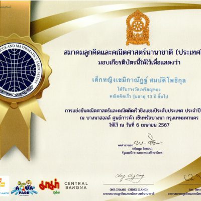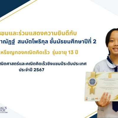 ขอชื่นชมและแสดงความยินดีกับ เด็กหญิงเขมิกาณัฏฐ์ สมบัตโพธิกุล นักเรียนชั้นมัธยมศึกษาปีที่ 2 ได้รับรางวัล เหรียญทอง คณิตคิดเร็ว รุ่นอายุ 13 ปี ขึ้นไป การแข่งขันคณิตศาสตร์และคณิตคิดเร็วชิงแชมป์ระดับประเทศ ประจำปี 2567 จัดโดยสมาคมลูกคิดและคณิตศาสตร์นานาชาติ(ประเทศไทย) ณ บางนาฮอลล์ เซ็นทรัลบางนา กรุงเทพมหานคร เมื่อวันที่ 6 เมษายน 2567