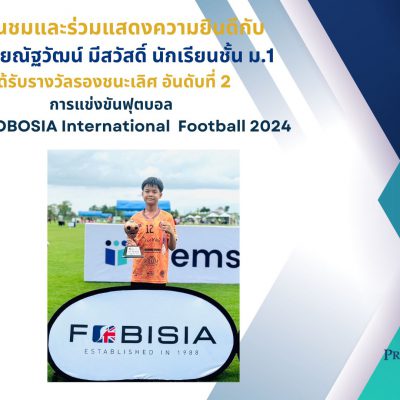 ขอชื่นชมและแสดงความยินดีกับ เด็กชายณัฐวัฒน์ มีสวัสดิ์ นักเรียนชั้นมัธยมศึกษาปีที่ 1 ได้รับรางวัลรองชนะเลิศอันดับที่ 2 การแข่งขันฟุตบอล รายการ FOBOSIA International Football 2024 เมื่อวันที่ 24-25 พฤษภาคม 2567 ณ สนามกอล์ฟ อัลไพน์