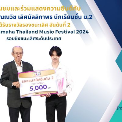 ขอชื่นชมและแสดงความยินดีกับ เด็กชายปุณณวิช เลิศมัลลิกาพร นักเรียนชั้นมัธยมศึกษาปีที่ 2 ได้รับรางวัลรองชนะเลิศอันดับ 2 ประเภท Classical Guitar Solo รุ่นอายุไม่เกิน 14 ปีในรายการ Yamaha Thailand Music Festival 2024 รอบชิงชนะเลิศระดับประเทศ เมื่อวันที่ 3 พฤษภาคม 2567 ณ หอประชุมมหิดลสิทธาคาร มหาวิทยาลัยมหิดล ศาลายา