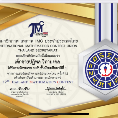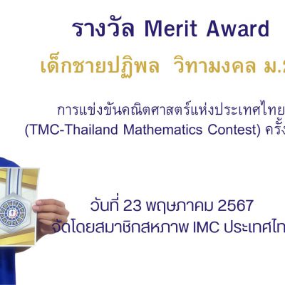 ขอชื่นชมและแสดงความยินดีกับ เด็กชายปฏิพล วิทามงคล นักเรียนชั้นมัธยมศึกษาปีที่ 2/2 ที่ได้รับรางวัล Merit Award จากการแข่งขันคณิตศาสตร์แห่งประเทศไทย (TMC-Thailand Mathematics Contest)ครั้งที่ 12 จัดโดยสมาชิกสหภาพ IMC ประเทศไทยเป็นการแข่งขันระดับชาติ เมื่อวันที่ 23 พฤษภาคม พ.ศ.2567