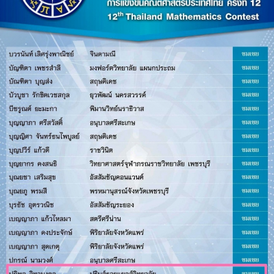 ขอชื่นชมและแสดงความยินดีกับ เด็กชายปฏิพล วิทามงคล นักเรียนชั้นมัธยมศึกษาปีที่ 2/2 ที่ได้รับรางวัล Merit Award จากการแข่งขันคณิตศาสตร์แห่งประเทศไทย (TMC-Thailand Mathematics Contest)ครั้งที่ 12 จัดโดยสมาชิกสหภาพ IMC ประเทศไทยเป็นการแข่งขันระดับชาติ เมื่อวันที่ 23 พฤษภาคม พ.ศ.2567