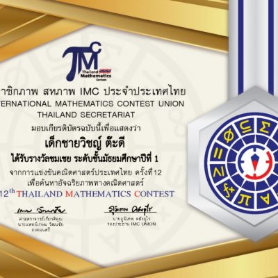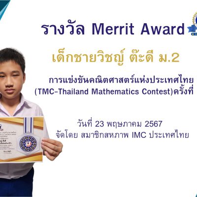 ขอชื่นชมและแสดงความยินดีกับ เด็กชายวิชญ์ ต๊ะดี นักเรียนชั้นมัธยมศึกษาปีที่ 2/2 ที่ได้รับรางวัล Merit Award จากการแข่งขันคณิตศาสตร์แห่งประเทศไทย (TMC-Thailand Mathematics Contest)ครั้งที่ 12 จัดโดยสมาชิกสหภาพ IMC ประเทศไทยเป็นการแข่งขันระดับชาติ เมื่อวันที่ 23 พฤษภาคม พ.ศ.2567
