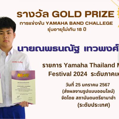 – รางวัล Gold Prize จากการแข่งขัน Yamaha Band Challege รุ่นอายุไม่เกิน 18 ปี ในรายการ Yamaha Thailand Music Festival 2024 ระดับภาคเหนือ เมื่อวันที่ 25 มกราคม 2567 (อัดคลิปส่ง) จัดแข่งขันโดย สถาบันดนตรียามาฮ่า (ระดับภาค)