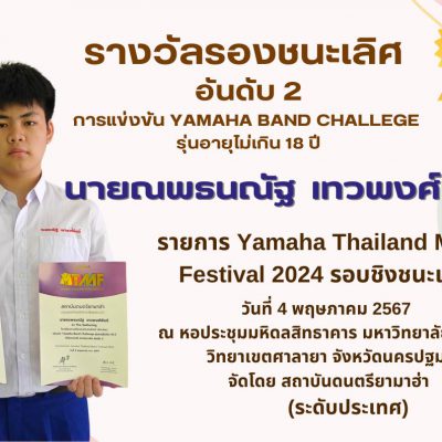 – รางวัลรองชนะเลิศ อันดับ 2 จากการแข่งขัน Yamaha Band Challege รุ่นอายุไม่เกิน 18 ปี ในรายการ Yamaha Thailand Music Festival 2024 รอบชิงชนะเลิศ ระดับประเทศ เมื่อวันที่ 4 พฤษภาคม 2567 ณ หอประชุมมหิดลสิทธาคาร มหาวิทยาลัยมหิดล วิทยาเขตศาลายา จังหวัดนครปฐม จัดการแข่งขันโดย สถาบันดนตรียามาฮ่า (ระดับประเทศ)