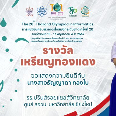 ขอชื่นชมและแสดงความยินดีกับ นางสาวธัญญาดา ทองใบ ม.6/7 ที่ได้รับรางวัลเหรียญทองแดง จากการแข่งขันคอมพิวเตอร์โอลิมปิกระดับชาติ ครั้งที่ 20 The 20th Thailand Olympiad in Informatics ระหว่างวันที่ 13 – 17 พฤษภาคม 2567 ณ ศูนย์ศิลปวัฒนธรรมเฉลิมพระเกียรติ 6 รอบ พระชนมพรรษาและคณะวิทยาศาสตร์ มหาวิทยาลัยศิลปากร จังหวัดนครปฐม จัดโดย คณะวิทยาศาสตร์ มหาวิทยาลัยศิลปากร ร่วมกับ ภาควิชาคอมพิวเตอร์ (ระดับประเทศ)