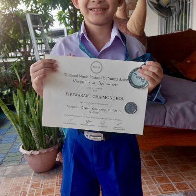 เด็กชายภูวกันต์ ไชยมงคล นักเรียนระดับชั้นประถมศึกษาปีที่ 2/7 ได้รับรางวัล Silver Prize Acoustic Drum Category Under 9 จากรายการแข่งขัน Thailand Music Festival For Young Artist