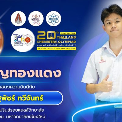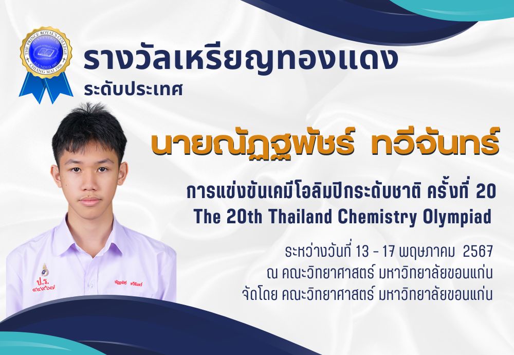 ขอชื่นชมและแสดงความยินดีกับ นายณัฏฐพัชร ทวีจันทร์ ม.5/3 ที่ได้รับรางวัลเหรียญทองแดง จากการแข่งขันเคมีโอลิมปิกระดับชาติ ครั้งที่ 20th The 20th Thailand Chemistry Olympiad (TChO20) ระหว่างวันที่ 13 – 17 พฤษภาคม 2567 ณ คณะวิทยาศาสตร์ มหาวิทยาลัยขอนแก่น จัดโดย คณะวิทยาศาสตร์ มหาวิทยาลัยขอนแก่น (ระดับประเทศ)
