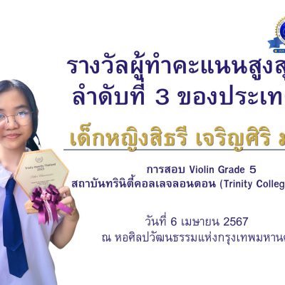 ขอชื่นชมและแสดงความยินดีกับ เด็กหญิงสิธรี เจริญศิริ นักเรียนชั้นมัธยมศึกษาปีที่ 2/6 สมาชิกวง PRC String Orchestra Band ได้รับรางวัลผู้สอบที่ทำคะแนนได้สูงสุดอันดับที่ 3 ของประเทศในปี 2023 โดยทำคะแนนจากการสอบ Violin Grade 5 การสอบของสถาบันทรินิตี้คอลเลจลอนดอน (Trinity College London) ณ หอศิลปวัฒนธรรมแห่งกรุงเทพมหานคร เมื่อวันที่ 6 เมษายน 2024