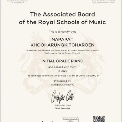 ขอชื่นชมและร่วมแสดงความยินดีกับ เด็กหญิงณปภัช คูหารุ่งกิจเจริญ นักเรียนระดับชั้นประถมศึกษาปีที่ 2/4 ได้รับเกียรตินิยมอันดับ 2 ( คะแนน 120/150) จากการสอบ ABRSM Piano performance Grade Initial รายการแข่งขันสอบ Piano Grade Initial โดยสถาบัน The Associated Board of the Royal Schools of Music (ABRSM) จากประเทศอังกฤษ รูปแบบออนไลน์ เมื่อวันที่ 24 เมษายน 2567