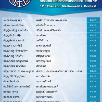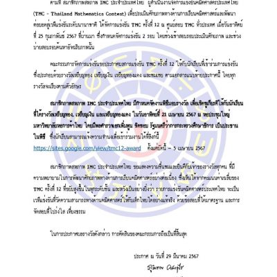 ขอชื่นชมและแสดงความยินดีกับ นางสาวกัญญ์ณณัฏฐ์ จอมใจป้อ ม.4/1 ที่ได้รับรางวัล Merit Award (ชมเชย) จากการแข่งขันคณิตศาสตร์แห่งประเทศไทย (TMC-Thailand Mathematics Contest) ครั้งที่ 12 ได้รับรางวัลเมื่อ 23 พฤษภาคม พ.ศ.2567 ณ โรงเรียนอนุบาลเชียงใหม่ จัดโดย สมาชิกสหภาพ IMC ประเทศไทย (ระดับประเทศ)