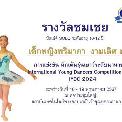 ขอชื่นชมและร่วมแสดงความยินดีกับ เด็กหญิงพริมาภา งามเลิศ นักเรียนชั้นรางวัลชมเชยบัลเล่ต์ SOLO ระดับอายุ 10-12 ปี การแข่งขัน นักเต้นรุ่นเยาว์ระดับนานาชาติ IYDC 2024 International Young Dancers Competition 2024 ระหว่างวันที่ 18-19 พฤษถาคม 2567 ณ หอประชุมใหญ่ สถาบันเทคโนโลยี พระจอมเกล้าเจ้าคุณทหารลาดกระบัง