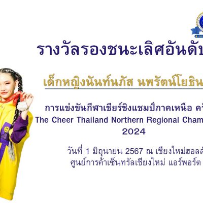 ขอชื่นชมและแสดงความยินดีกับ เด็กหญิงนันท์นภัส นพรัตน์โยธิน ชั้นมัธยมศึกษาปีที่ 1/10 รางวัลรองชนะเลิศอันดับที่ 1 รุ่น Primary Hip Hop Teams อายุ 8 – 12 ปี การแข่งขันกีฬาเชียร์ชิงแชมป์ภาคเหนือ ครั้งที่ 3 The Cheer Thailand Northern Regional Championship 2024 เมื่อวันที่ 1 มิถุนายน 2567 ณ เชียงใหม่ฮอลล์ ศูนย์การค้าเซ็นทรัล เชียงใหม่ แอร์พอร์ต