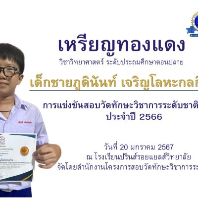 - ประกาศนียบัตรเหรียญทองแดงวิชาวิทยาศาสตร์ และรางวัลชมเชย วิชาภาษาอังกฤษ ระดับประถมศึกษาตอนปลาย การแข่งขันสอบวัดทักษะวิชาการระดับชาติ (สวช.) ประจำปี พ.ศ.2566 (รอบสุดยอดอัจฉริยภาพระดับประเทศ) วันที่ 20 มกราคม 2567 ณ โรงเรียนปรินส์รอยแยลส์วิทยาลัย จัดโดย สำนักงานโครงการสอบวัดทักษะวิชาการระดับชาติ