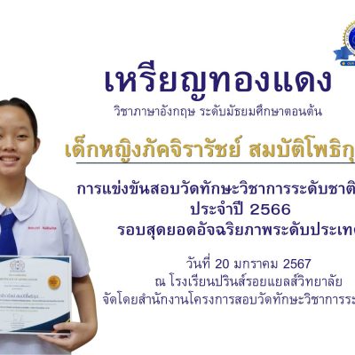 ขอชื่นชมและร่วมแสดงความยินดีกับ เด็กหญิงภัคจิรารัชย์ สมบัติโพธิกุล นักเรียนชั้นมัธยมศึกษาปีที่ 2/5 ได้รับ รางวัลประกาศนียบัตรเหรียญทองแดงวิชาภาษาอังกฤษ ระดับมัธยมศึกษาตอนต้น การแข่งขันสอบวัดทักษะวิชาการระดับชาติ (สวช.) ประจำปี พ.ศ.2566 (รอบสุดยอดอัจฉริยภาพระดับประเทศ) วันที่ 20 มกราคม 2567 ณ โรงเรียนปรินส์รอยแยลส์วิทยาลัย จัดโดย สำนักงานโครงการสอบวัดทักษะวิชาการระดับชาติ
