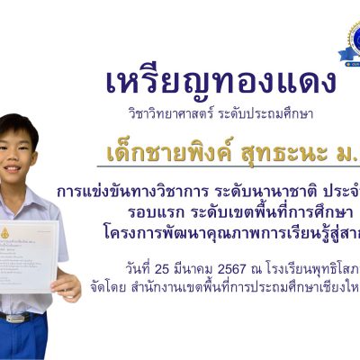 ขอชื่นชมและร่วมแสดงความยินดีกับ เด็กชายพิงค์ สุทธะนะ นักเรียนชั้นมัธยมศึกษาปีที่ 1/7 ได้รางวัลเหรียญทองแดง ระดับเขตพื้นที่การศึกษา วิชาวิทยาศาสตร์ ระดับประถมศึกษา ในการแข่งขันวิชาการระดับนานาชาติ จัดโดยสำนักงานคณะกรรมการการศึกษาขั้นพื้นฐาน (สพฐ.) จัดสอบที่ โรงเรียนพุทธิโศภณ เมื่อวันที่ 17 มีนาคม 2567