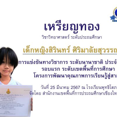 ขอชื่นชมและร่วมแสดงความยินดีกับ เด็กหญิงสิรินทร์ ศิริมาลัยสุวรรณ นักเรียนชั้นมัธยมศึกษาปีที่ 1/3 ได้รางวัลเหรียญทอง ระดับเขตพื้นที่การศึกษา วิชาวิทยาศาสตร์ ระดับประถมศึกษา ในการแข่งขันวิชาการระดับนานาชาติ จัดโดยสำนักงานคณะกรรมการการศึกษาขั้นพื้นฐาน (สพฐ.) จัดสอบที่ โรงเรียนพุทธิโศภณ เมื่อวันที่ 17 มีนาคม 2567