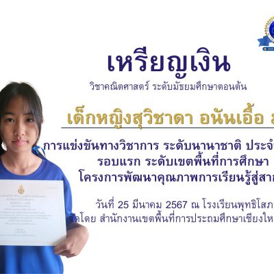 ขอชื่นชมและร่วมแสดงความยินดีกับ เด็กหญิงสุวิชาดา อนันเอื้อ นักเรียนชั้นมัธยมศึกษาปีที่ 2/2 ได้รางวัลเหรียญเงิน ระดับเขตพื้นที่การศึกษา วิชาคณิตศาสตร์ ระดับมัธยมศึกษาตอนต้น ในการแข่งขันวิชาการระดับนานาชาติ จัดโดยสำนักงานคณะกรรมการการศึกษาขั้นพื้นฐาน (สพฐ.) จัดสอบที่ โรงเรียนพุทธิโศภณ เมื่อวันที่ 17 มีนาคม 2567