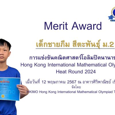 ขอชื่นชมและร่วมแสดงความยินดีกับ เด็กชายภีม สีตะพันธุ์ นักเรียนชั้นมัธยมศึกษาปีที่ 2/4 ได้รับรางวัล Merit Award การแข่งขันคณิตศาสตร์ รายการ Hong Kong International Mathematical Olympiad Heat Round 2024 ณ อาคารศิริพานิช เชียงใหม่ ประกาศผลวันที่ 28 พฤษภาคม 2567 จัดโดย HKIMO Hong Kong International Mathematical Olympiad Thailand