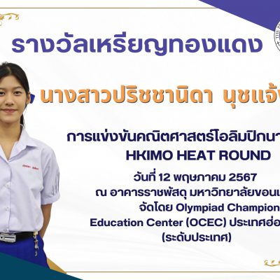 ขอชื่นชมและแสดงความยินดีกับ นางสาวปริชชานิดา นุชแจ้งบง ม.4/1 ที่ได้รับรางวัลเหรียญทองแดง จากการแข่งขันคณิตศาสตร์โอลิมปิกนานาชาติ HKIMO HEAT ROUND เมื่อวันที่ 12 เดือน พฤษภาคม พ.ศ. 2567 ณ อาคารสิริพาณิชย์ จัดโดย Olympiad Champion Education Center ประเทศฮ่องกง (ระดับประเทศ)