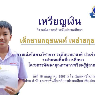 ขอชื่นชมและร่วมแสดงความยินดีกับ เด็กชายกฤชนนท์ เหล่าสกุล นักเรียนชั้นมัธยมศึกษาปีที่ 1/3 ได้รางวัลเหรียญเงิน วิชาคณิตศาสตร์ ระดับประถมศึกษา เขตพื้นที่การศึกษา ในการแข่งขันวิชาการระดับนานาชาติประจำปี 2567 จัดโดยสำนักงานคณะกรรมการการศึกษาขั้นพื้นฐาน (สพฐ.) จัดสอบที่ โรงเรียนพุทธิโศภณ เมื่อวันที่ 25 มีนาคม 2567