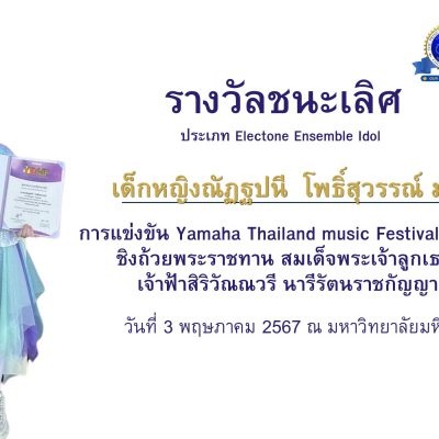 ขอชื่นชมและแสดงความยินดีกับ เด็กหญิงณัฏฐปนี โพธิ์สุวรรณ์ นักเรียนชั้นมัธยมศึกษาปีที่ 1/8 ได้รับรางวัลชนะเลิศอันดับ 1 ถ้วยพระราชทาน สมเด็จพระเจ้าลูกเธอ เจ้าฟ้าสิริวัณณวรี นารีรัตนราชกัญญาในประเภท Electone Ensemble Idol รุ่นอายุไม่เกิน 18 ปี ในการประกวด Yamaha Thailand Music Festival 2024 เมื่อวันที่ 3 พฤษภาคม 2567 ณ มหาวิทยาลัยมหิดล
