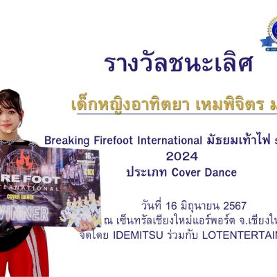 ขอชื่นชมและร่วมแสดงความยินดีกับ เด็กหญิงอาทิตยา เหมพิจิตร นักเรียนชั้นมัธยมศึกษาปีที่ 1 ได้รับรางวัลชนะเลิศ การแข่งขันรายการ “Breaking Firefoot International มัธยมเท้าไฟ season3 2024” ประเภท Cover Dance เมื่อวันที่ 16 มิถุนายน 2567 ณ เซ็นทรัลเชียงใหม่แอร์พอร์ต จ.เชียงใหม่ จัดโดย IDEMITSU ร่วมกับ LOTENTERTAINMENT