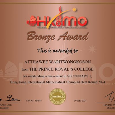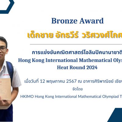 ขอชื่นชมและร่วมแสดงความยินดีกับ เด็กชายอัทธวีร์ วริศวงศ์โกศล นักเรียนชั้นมัธยมศึกษาปีที่ 2/2 ได้รับรางวัล Bronz Award การแข่งขันคณิตศาสตร์ รายการ Hong Kong International Mathematical Olympiad Heat Round 2024 ณ อาคารศิริพานิช เชียงใหม่ ประกาศผลวันที่ 28 พฤษภาคม 2567 จัดโดย HKIMO Hong Kong International Mathematical Olympiad Thailand