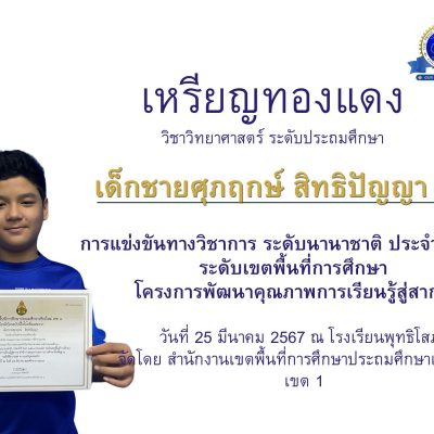 ขอชื่นชมและร่วมแสดงความยินดีกับเด็กชายศุภฤกษ์ สิทธิปัญญา นักเรียนชั้นมัธยมศึกษาปีที่ 1/4 ได้รางวัลเหรียญทองแดงวิชาวิทยาศาสตร์ ระดับประถมศึกษา ระดับเขตพื้นที่การศึกษา ในการแข่งขันวิชาการระดับนานาชาติประจำปี 2567 จัดโดยสำนักงานคณะกรรมการการศึกษาขั้นพื้นฐาน (สพฐ.) จัดสอบที่ โรงเรียนพุทธิโศภณ เมื่อวันที่ 17 มีนาคม 2567