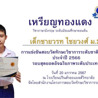 เด็กชายวรท ไชยวงศ์ ประกาศนียบัตรเหรียญทองแดง วิชาภาษาอังกฤษระดับมัธยมศึกษาตอนต้น การแข่งขันสอบวัดทักษะวิชาการระดับชาติ (สวช.) ประจำปี พ.ศ.2566