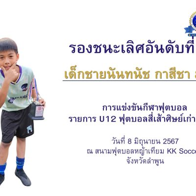 ขอชื่นชมและร่วมแสดงความยินดีกับ เด็กชายนันทนัช กาสีชา นักเรียนชั้นมัธยมศึกษาปีที่ 1/8 ได้รับรางวัลผู้รักษาประตูยอดเยี่ยม และ รางวัลรองชนะเลิศอันดับ 2 ในรายการ U12 ฟุตบอลสี่เส้าศิษย์เก่ายุพราช วันที่ 8 มิถุนายน 2567 ณ สนามฟุตบอลหญ้าเทียม KK Soccer จังหวัดลำพูน
