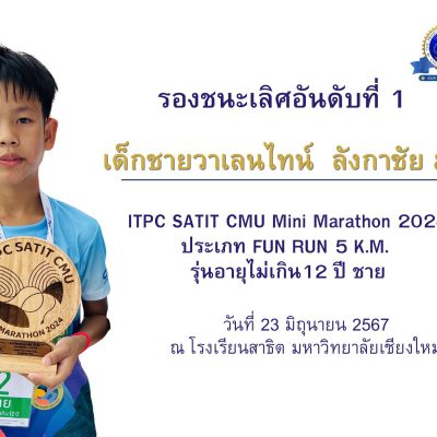 ขอชื่นชมและร่วมแสดงความยินดีกับ เด็กชายวาเลนไทน์ ลังกาชัย นักเรียนชั้นมัธยมศึกษาปีที่ 1/2 ได้รับรางวัลรองชนะเลิศอันดับ 1 การแข่งขันวิ่งรายการ ITPC SATIT CMU Mini ประเภท FUN RUN 5 K.M. รุ่นอายุไม่เกิน 12 ปี ชาย ณ โรงเรียนสาธิตมหาวิทยาลัยเชียงใหม่ เมื่อวันที่ 23 มิถุนายน พ.ศ. 2567
