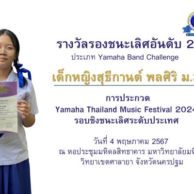 ขอชื่นชมและร่วมแสดงความยินดีกับ เด็กหญิงสุธีกานต์ พลศิริ นักเรียนชั้นมัธยมศึกษาปีที่ 3/13 ได้รับรางวัลรองชนะเลิศ อันดับ 2 ประเภท Yamaha Band Challenge รุ่นอายุไม่เกิน 18 ปี การประกวด Yamaha Thailand Music Festival 2024 รอบชิงชนะเลิศระดับประเทศ ณ หอประชุมมหิดลสิทธาคาร มหาวิทยาลัยมหิดล วิทยาเขตศาลายา จังหวัดนครปฐม