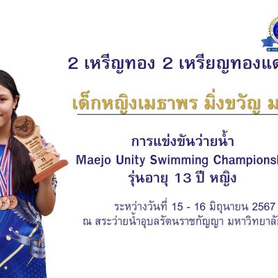 ขอชื่นชมและร่วมแสดงความยินดีกับ เด็กหญิงเมธาพร มิ่งขวัญ นักเรียนชั้นมัธยมศึกษาปีที่ 2/10 ได้รับรางวัล 2 เหรียญทอง รายการ กบ 50 เมตร กรรเชียง 100 เมตร 2 เหรียญทองแดง กรรเชียง 50 เมตร ผีเสื้อ 100 เมตร และถ้วยรางวัลชนะเลิศอันดับ 11 รุ่นอายุ 13 ปี หญิง ในการแข่งขันว่ายน้ำ Maejo Unity Swimming Championship วันที่ 15-16 มิถุนายน 2567 ณ สระว่ายน้ำอุบลรัตนราชกัญญา มหาวิทยาลัยแม่โจ้