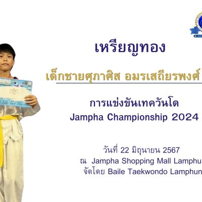 ขอชื่นชมและร่วมแสดงความยินดีกับ เด็กชายศุภาศิส อมรเสถียรพงศ์ นักเรียนชั้นมัธยมศึกษาปีที่ 1/9 ได้รับเหรียญทอง ประเภทต่อสู้คลาส C อายุ 12 – 14 ปี ชาย น้ำหนัก 37 – 41 กก. การแข่งขันเทควันโด Jampha Championship 2024 วันที่ 22 มิถุนายน 2567 ณ Jampha Shopping Mall Lamphun จัดโดย สโมสร Baile Taekwondo Lamphun