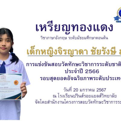 ขอชื่นชมและร่วมแสดงความยินดีกับเด็กหญิงจิรญาดา ชัยรังษี นักเรียนชั้นมัธยมศึกษาปีที่ 2/3 ได้รับ รางวัลประกาศนียบัตรเหรียญทองแดง วิชาภาษาอังกฤษระดับมัธยมศึกษาตอนต้น การแข่งขันสอบวัดทักษะวิชาการระดับชาติ (สวช.) ประจำปี พ.ศ.2566 (รอบสุดยอดอัจฉริยภาพระดับประเทศ) วันที่ 20 มกราคม 2567 ณ โรงเรียนปรินส์รอยแยลส์วิทยาลัย จัดโดย สำนักงานโครงการสอบวัดทักษะวิชาการระดับชาติ
