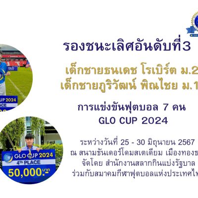 ขอชื่นชมและร่วมแสดงความยินดีกับ เด็กชายธนเดช โรเบิร์ต และเด็กชายภูริวัฒ พิณไชย นักเรียนชั้นมัธยมศึกษาตอนต้น ได้รับรางวัลรองชนะเลิศ อันดับ 3 การแข่งขันกีฬาฟุตบอล 7 คน รุ่นอายุไม่เกิน 13 ปี รายการ GLO CUP 2024 จัดโดยสำนักงานสลากกินแบ่งรัฐบาลร่วมกับสมาคมกีฬาฟุตบอลแห่งประเทศไทย เมื่อ วันที่ 25-30 มิถุนายน 2567 ณ สนามธันเดอร์โดมสเตเดียม เมืองทองธานี จังหวัดนนทบุรี