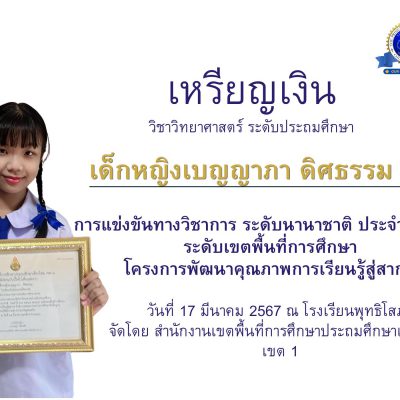 ขอชื่นชมและร่วมแสดงความยินดีกับ เด็กหญิงเบญญาภา ดิศธรรม นักเรียนชั้นมัธยมศึกษาปีที่ 1/1 ได้รางวัลเหรียญเงิน วิชาวิทยาศาสตร์ ระดับประถมศึกษา ระดับเขตพื้นที่การศึกษา ในการแข่งขันวิชาการระดับนานาชาติประจำปี 2567 จัดโดยสำนักงานคณะกรรมการการศึกษาขั้นพื้นฐาน (สพฐ.) จัดสอบที่ โรงเรียนพุทธิโศภณ เมื่อวันที่ 17 มีนาคม 2567