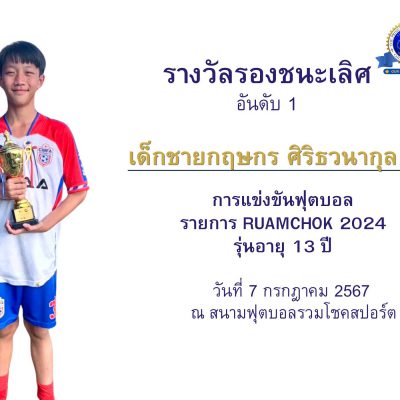 เด็กชายกฤษกร ศิริธวนากุล รางวัลรองชนะเลิศ อันดับ 1 รุ่นอายุ 13 ปี . การแข่งขันฟุตบอล รายการ RUAMCHOK 2024